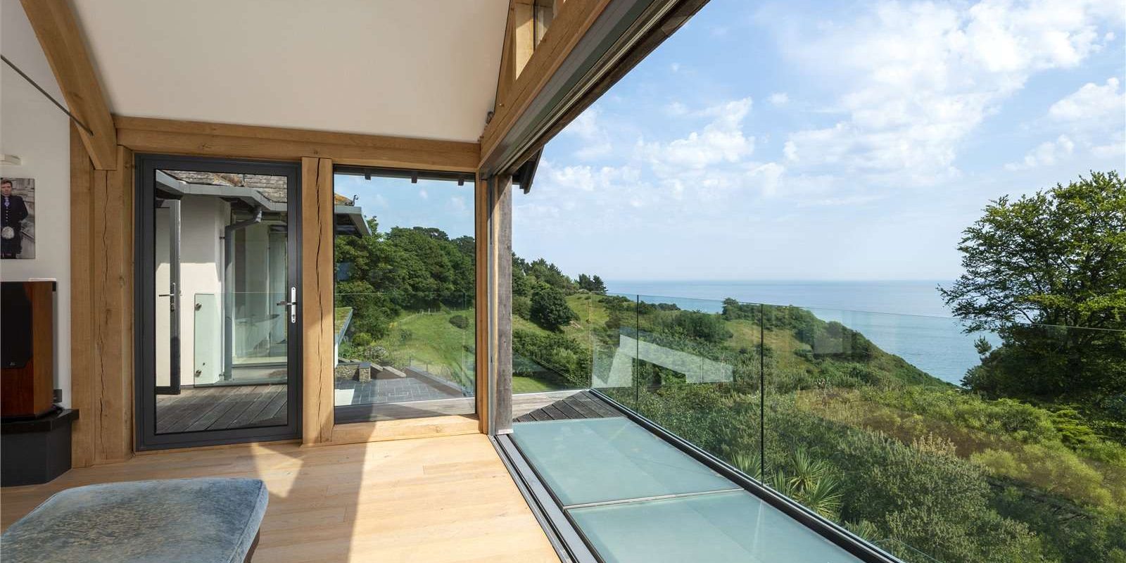 The ground floor is laid out as a series of breakaway areas, including a snug/library with a wood-burning stove and a sun room. The living room, which is built with no corner posts to distract from the sensational views, has a glazed wall that opens onto the adjoining terrace.